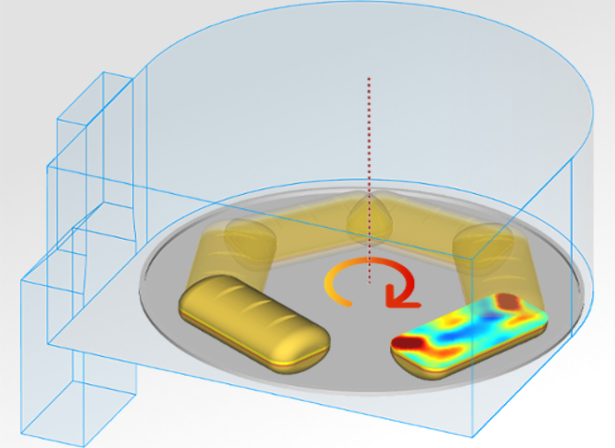 Microwave heating analysis including loads rotation and translation, frequency tuning, heat flow and material parameters modification as a function of dissipated power.