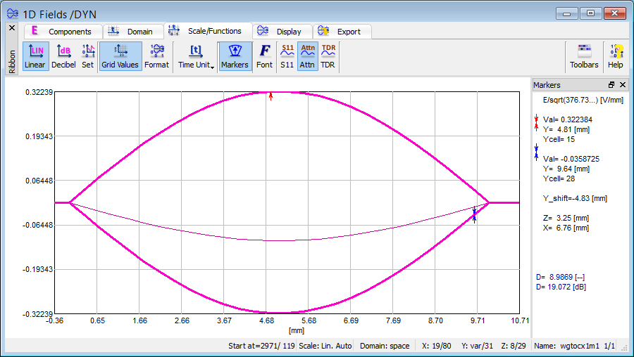 The attenuation between two points in the circuit. This feature is available in the 1D Fields window, after switching to space domain and activating Attn function. The attenuation is calculated between two point indicated by the markers (cursors).
