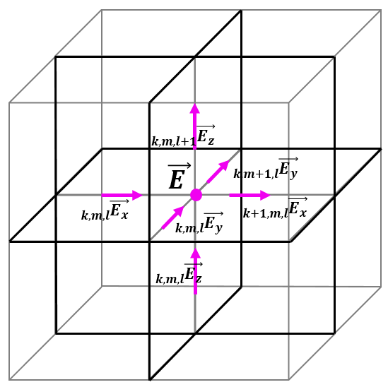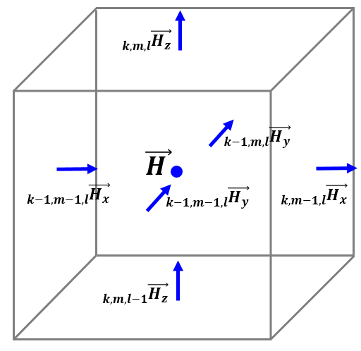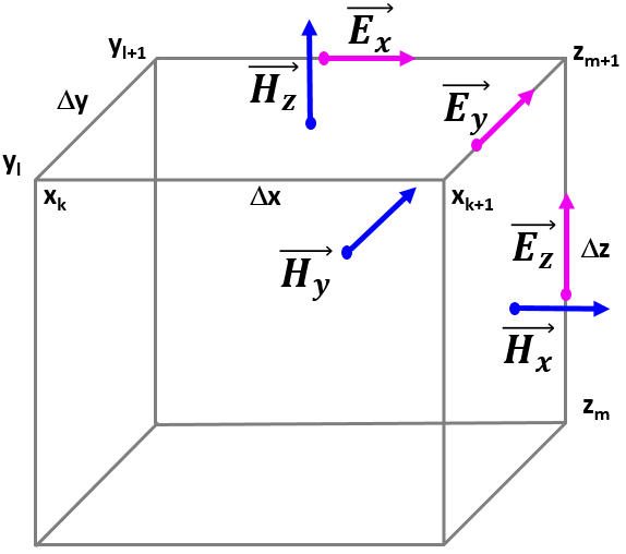 In FDTD method the entire computational domain is divided into FDTD cells, based on the so-called Yee's cell, in which different field components are defined in different space position. The space arrangement of all six electromagnetic field components in the Yee's cel is as follows: