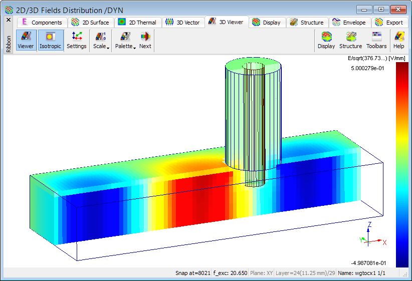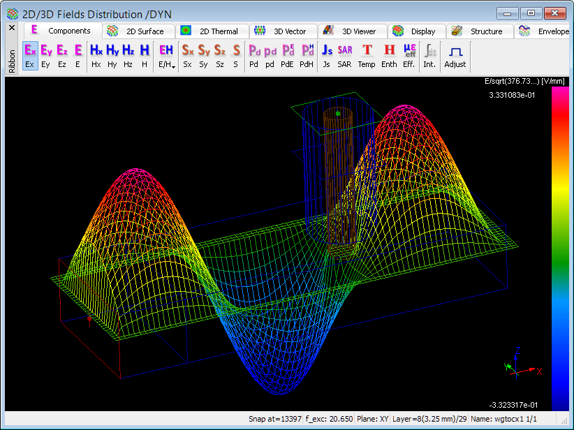 QuickWave offers also the Viewer 3D display of time-dependent electric and magnetic fields (Ex, Ey, Ez, Hx, Hy, Hz, total E, total H) distribution. This feature is enabled in 2D/3D Fields Distribution window and allows for displaying the instantaneous, time-maximum, and time-average of electric and magnetic fields.