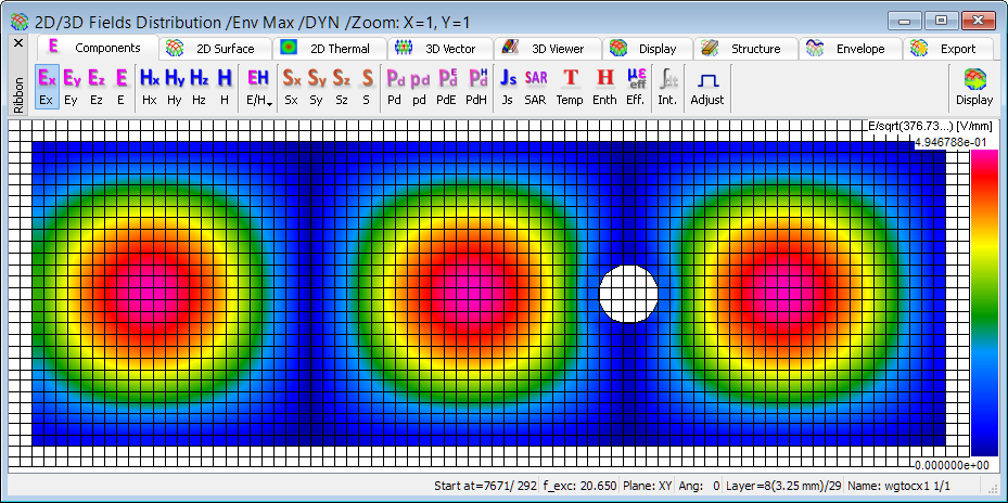 The time-dependent 2D distribution of the electric field (directional components Ex, Ey, Ez, and total E-field) and magnetic field (directional components Hx, Hy, Hz, and total H-field), is available for every FDTD layer along each of three axes. The 2D electric and magnetic field distributions are available in 2D/3D Fields Distribution window, which enables time domain monitoring and displaying of the amplitude (instantaneous, time-maximum, time-average) of total electric and total magnetic fields as well as their directional components (Ex, Ey, Ez, Hx, Hy, Hz).