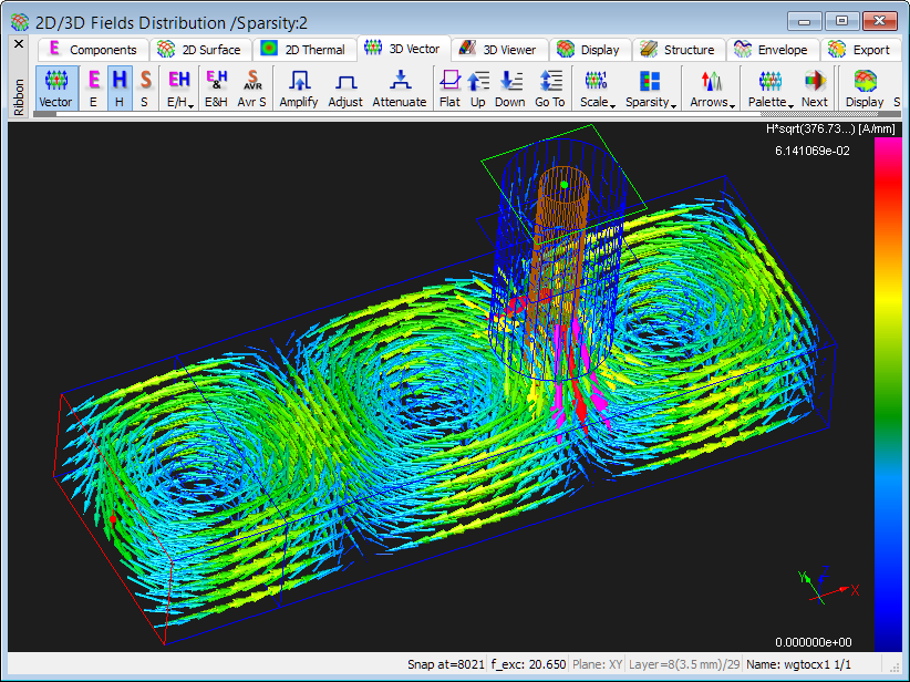 QuickWave delivers time-dependent 3D vector display of the instantaneous total electric and total magnetic field distribution. This feature is enabled in 2D/3D Fields Distribution window and allows for displaying total electric and total magnetic field in the circuit with arrows. The 3D vector display is not enabled for directional components of electric and magnetic fields, but allows for displaying total electric and total magnetic field distribution simultaneously at one display.