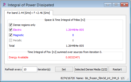 The calculations of power dissipated, energy stored, and Q-factor are physically meaningful in the steady-state sinusoidal excitation regime. However sometimes we are interested in the total power dissipated in the circuit when it is excited by a pulse of limited duration. This requires performing time integration of power dissipated. Such information is available in Integral of Power Dissipated window. This feature delivers Space & Time Integral of Pdiss in [nJ], given for both electric and magnetic fields.