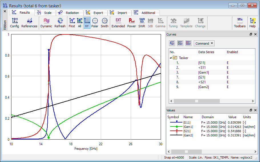 As an example of below cutoff calculations, the results for rectangular waveguide to coaxial line transition may be considered. |Gam1| and |Gam2| denote the absolute values of propagation constants in the transmission lines terminated by ports 1 and 2, respectively. It can be seen that at port 1 (waveguide input) the propagation constant drops to 0 at the waveguide cutoff (15 GHz), while at the TEM output |Gam2| is naturally proportional to the frequency.