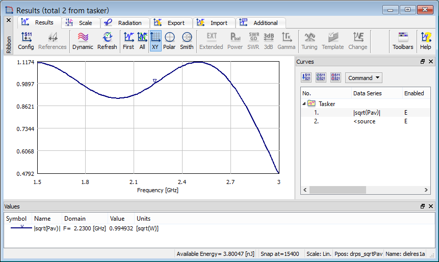 In some applications the user may be interested what is the total energy of the input pulse or with power flux obtained with ExH Time Integral post-processing. In particular, that information may be confronted with the total energy dissipated in the considered structure or with ExH Time Integral post-processing. Power Available post-processing provides information about the total energy available (in [nJ]) in the input pulse. The energy available from the source can be read from the status bar of the Results window.