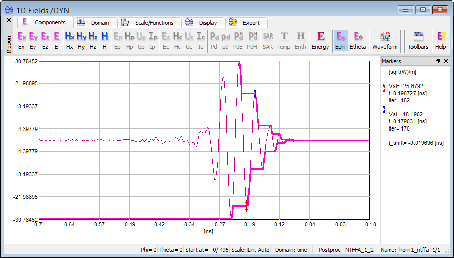 The first stage of the NTFFA post-processing delivers the impulse response in the far field, for a set of fixed directions. The results, as time domain variations of Etheta and Ephi are available via 1D Fields window. Direction information containing the pair of Phi and Theta angles is displayed in the status bar.