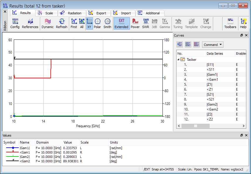 Frequency dependent propagation constant is calculated when S-Parameters post-processing is active. The magnitude is available in a standard Results window display and the phase becomes available when the results are displayed in the Extended Results regime.