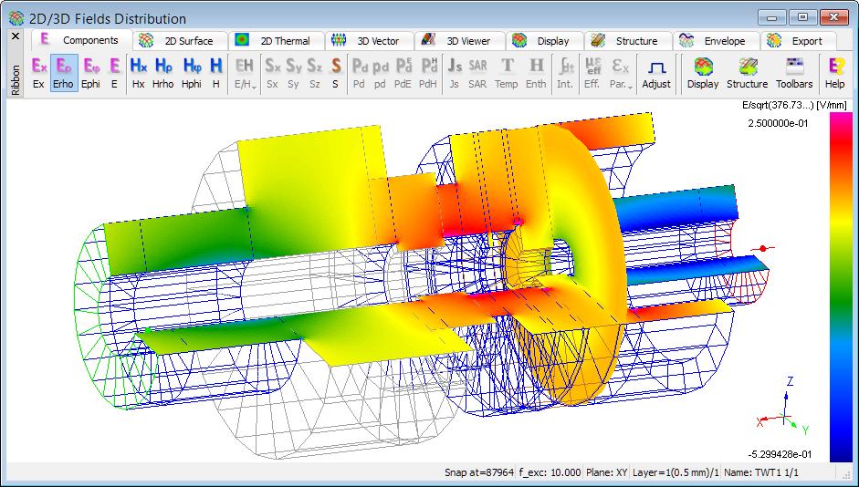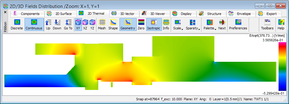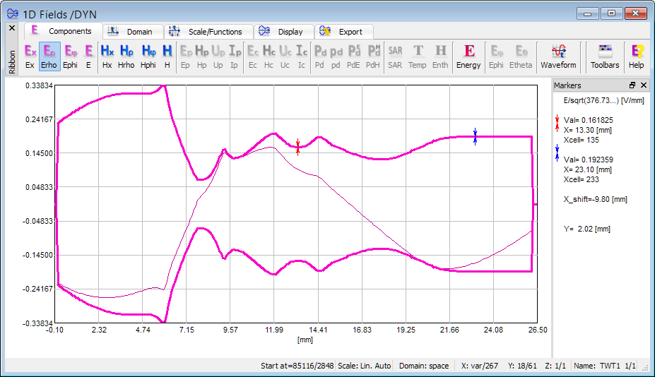 QuickWave delivers 1D distribution display, which allows time domain monitoring of the electric field (directional components Ex, Eρ, Eφ, and total E-field) and magnetic field (directional components Hx, Hρ, Hφ, and total H-field) along any line parallel to one of the x or ρ axes or in a particular point of the circuit versus time. The 1D monitoring delivers instantaneous and envelope (time-maximum) values of the chosen quantity and is available in 1D Fields window.