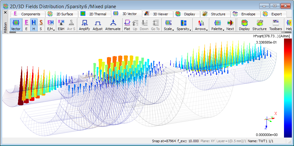 QuickWave delivers time-dependent 3D vector display of the instantaneous total electric and total magnetic field distribution. This feature is enabled in 2D/3D Fields Distribution window and allows for displaying total electric and total magnetic field in the circuit with arrows. The 3D vector display is not enabled for directional components of electric and magnetic fields, but allows for displaying total electric and total magnetic field distribution simultaneously at one display.