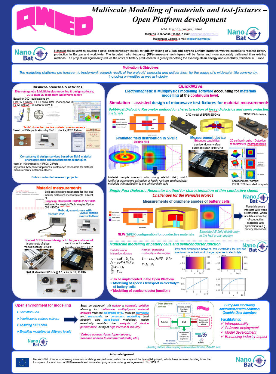 At the EMMC-2021, Wednesday afternoon Session "From Modelling to Experimental Characterisation for Energy Materials" was organised and chaired by Malgorzata Celuch. The session featured contributions from the recently finished H2020 MMAMA and the ongoing NanoBat projects. Open Modelling Platform initiated by QWED in the projects was presented in the talk by Marzena Olszewska-Placha, gaining new collaborations for the proposed Task Group on "Linking and Coupling Computational Chemistry to Electromagnetics". QWED company and our projects were further presented in the Virtual Exhibition.