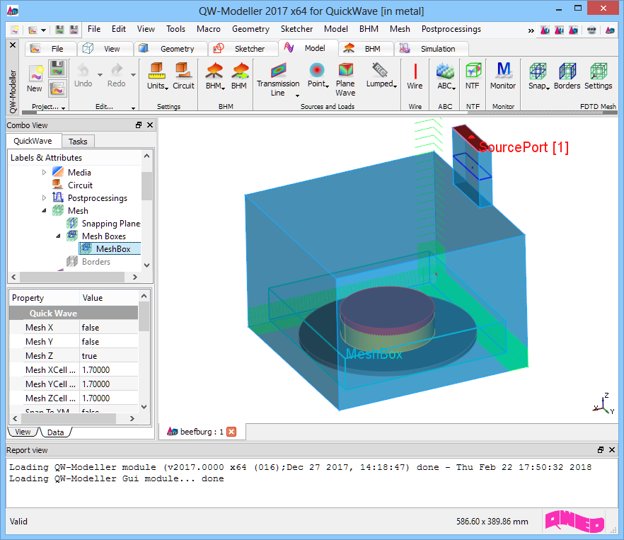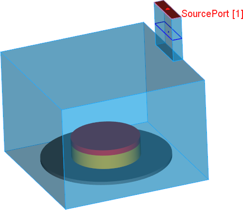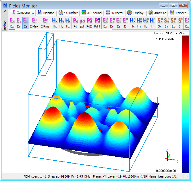 The oven's inside dimensions are 267 mm, 270 mm, 188 mm in X, Y, Z directions respectively. Its vertical feeding waveguide dimensions are 18 mm, 78 mm, 80 mm. The shelf diameter is 227 mm, its thickness is 6 mm and it is placed at 15 mm in Z directions. In the considered scenario, beef (120 mm diameter; 10 mm height) lies on a bread (120 mm diameter; 25 mm height) and the entire food is placed on the shelf.
