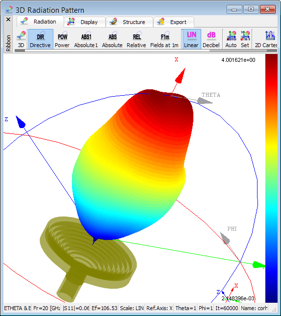 3D radiation pattern, with both Phi and Theta varying in steps, can be calculated in the 3D Radiation Pattern window. The 3D Radiation Patterns dialogue allows setting the reference axis and steps for angles Phi and Theta, defined with respect to that axis in the same way as for the 2D radiation pattern case. A single calculation frequency is also selected.