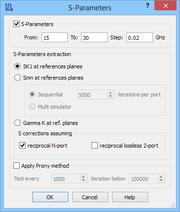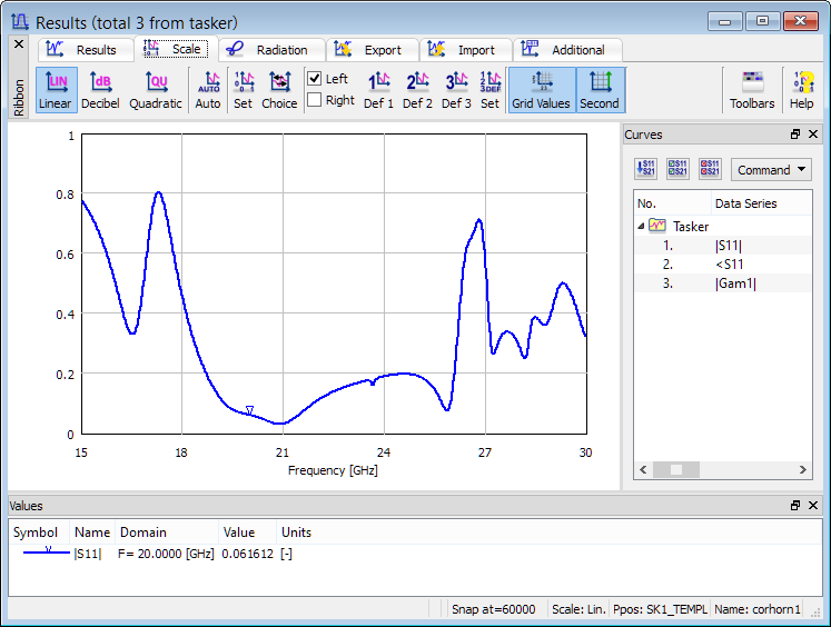 The antenna is fed by a fundamental TE11 circular waveguide mode and is to be analysed in the frequency range from 15 to 30 GHz. We are interested in obtaining reflection coefficient (S11) characteristic and the S-Parameters postprocessing is set from 15 GHz to 30 GHz with the frequency step of 0.02 GHz. The radiation pattern calculation is activated with Near To Far postprocessing and is set at 20GHz.