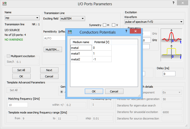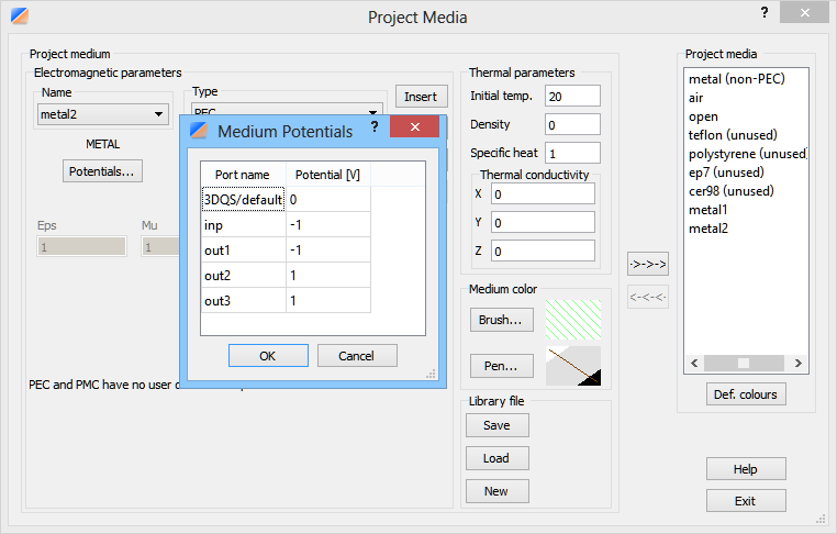 The potentials for metal2 in a particular port can be changed in the port dialogue. We can see that metal2 has in that port potential –1 (as noted previously) while metal has the potential 0 and metal1 – potential 1.