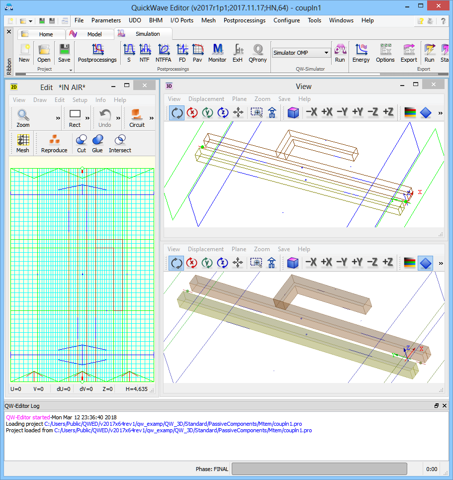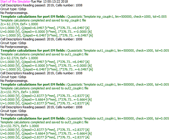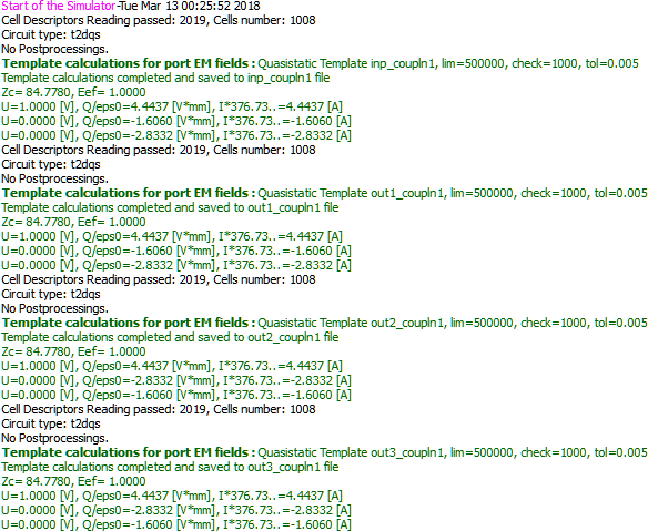 For a TEM template in a two-conductor line the presentation of the line impedance and effective permittivity is sufficient to characterise the line. To have full information about a multi-conductor line, we need to know the charge stored on each conductor and the current flowing in it under the conditions enforced by the particular distribution of voltages. Thus the Simulator Log presents this information with respect to each of the conductors. We have the voltage on it, the charge and the current. The units have been chosen in a way that charge and current are numerically equal in the case of an air-filled line. The considered port (inp) is defined on the odd mode (with voltages: +1,-1). Thus the detected impedance 62.27 W is the odd-mode impedance. For ports 3 and 4 we consider the even mode and thus the impedance 132.76 W detected there is the even-mode impedance.