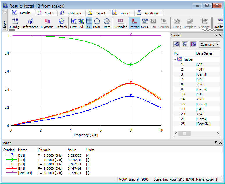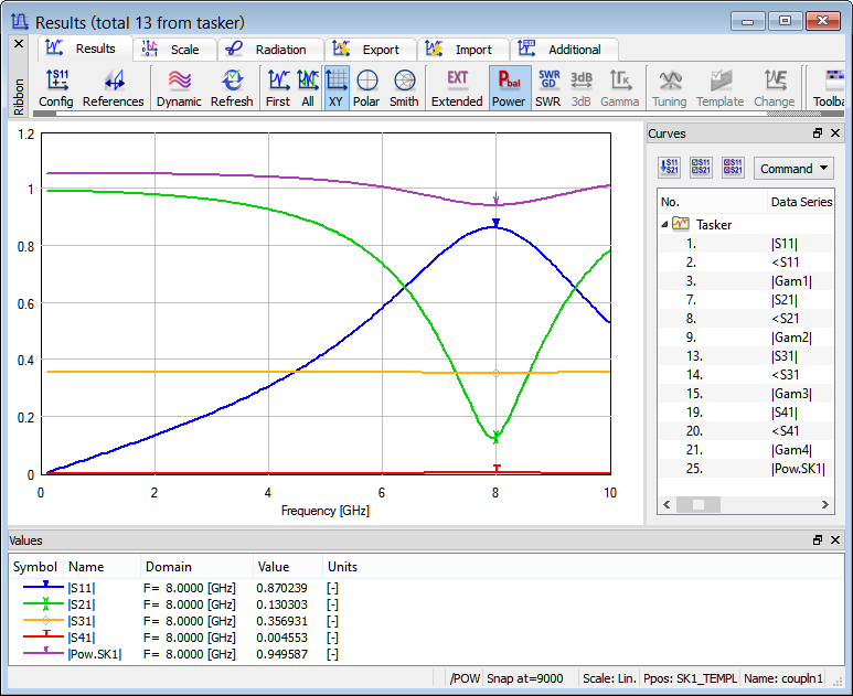 For low frequencies the two considered modes are decoupled. At 8 GHz the electrical length of the stub is close to half wavelengths. Thus one of the lines is close to being short-circuited and this causes a strong coupling between the odd and even modes. However, let us note that since the considered modes are orthogonal the power balance remains equal to 1 all over the frequency band.