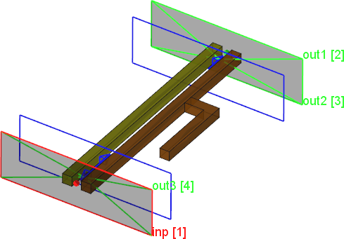 In the four ports existing in the project, the value in the four ports already existing in the projects the value of the potential for metal2 is -1 for ports inp and out1 and +1 for ports out2 and out3.