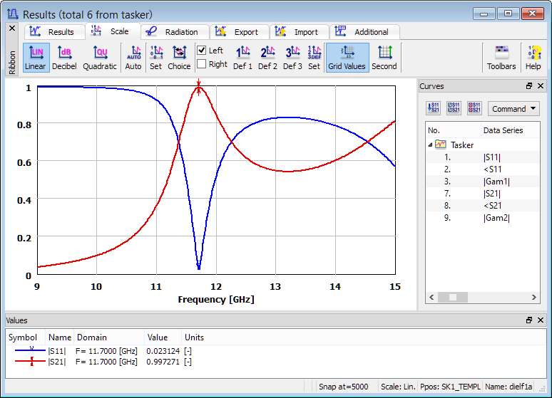 For the purpose of calculating reflection and transmission characteristics of the structure, the S-Parameters postprocessing is activated. The S-Parameters postprocessing is set from 9 GHz to 15 GHz with a frequency step of 0.02 GHz.