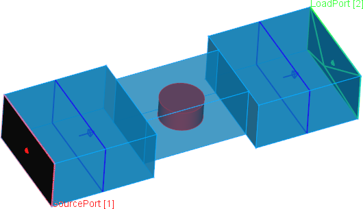 The waveguide's height is 10 mm and its total length is 60 mm. The width and length of the following sections are as follows: 20 mm and 20 mm, 20 mm and 12 mm, and 20 mm and 20 mm. The cylindrical resonator made of a medium of permittivity 5 is placed in a section of the guide of smaller width and its diameter is 8 mm.