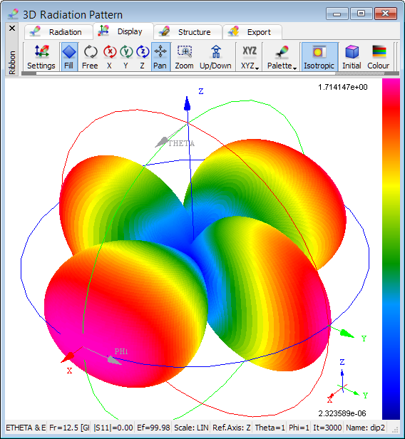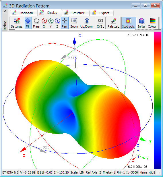 3D radiation pattern, with both Phi and Theta varying in steps, can be calculated in the 3D Radiation Pattern window. The 3D Radiation Patterns dialogue allows setting the reference axis and steps for angles Phi and Theta, defined with respect to that axis in the same way as for the 2D radiation pattern case. A single calculation frequency is also selected.
