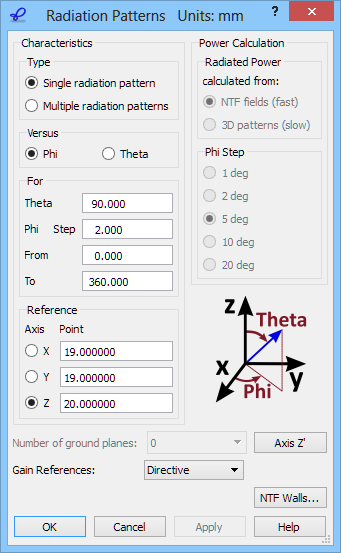 We wish to calculate the 2D radiation patterns versus angle Phi varying between 0 and 360 degrees with a step of 2 degrees. They will be calculated with a constant Theta angle equal to 90 degrees. The definition of the angles is explained in the lower right part of the 2D Radiation Patterns configuration dialogue. Note that this definition depends on the choice of the reference axis. The angle Theta is always counted from the reference axis (Z in the considered example). The angle Phi is always counted around it.