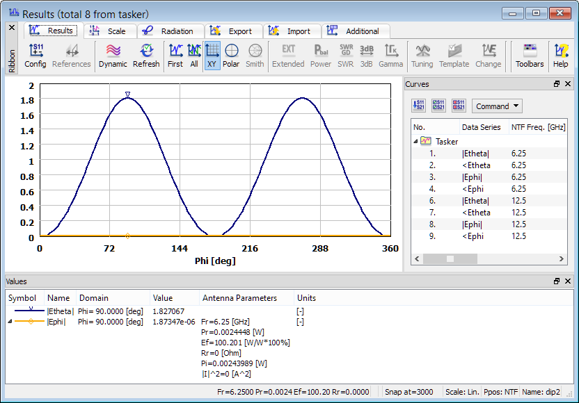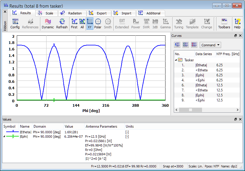 The radiation pattern calculations are set at 6.25 GHz and 12.5 GHz.