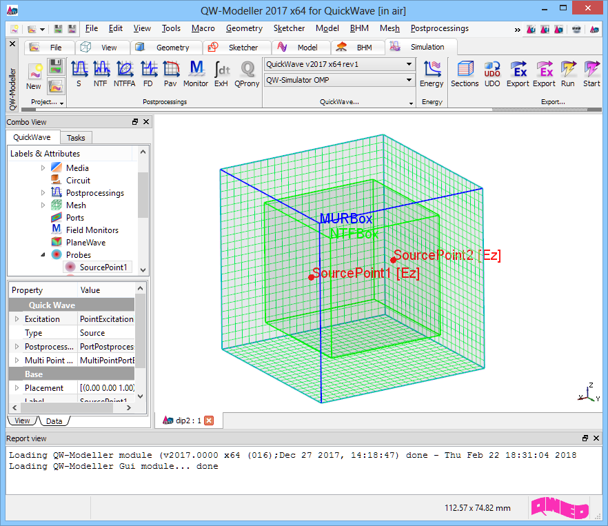 Two dipoles are placed in a cubic volume with a side of 48 mm. The dipoles are placed symmetrically in the considered space and are separated by a distance of 24 mm. The absorbing boundary conditions have been assigned to exterior boundaries of the cubic volume to model free space surrounding. In this case we use MUR absorbing boundary conditions (MUR Box - blue box). For the purpose of calculating radiation patterns it is required to insert the NTF box. NTF Box (green box) is a virtual box determining the boundaries at which the near-to-far field transformation will be executed. In this scenario the NTF Box is placed 8 mm from the absorbing walls towards the dipoles.