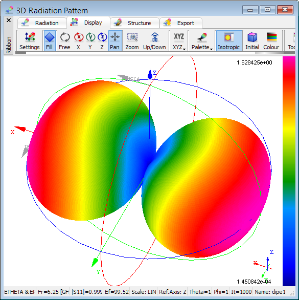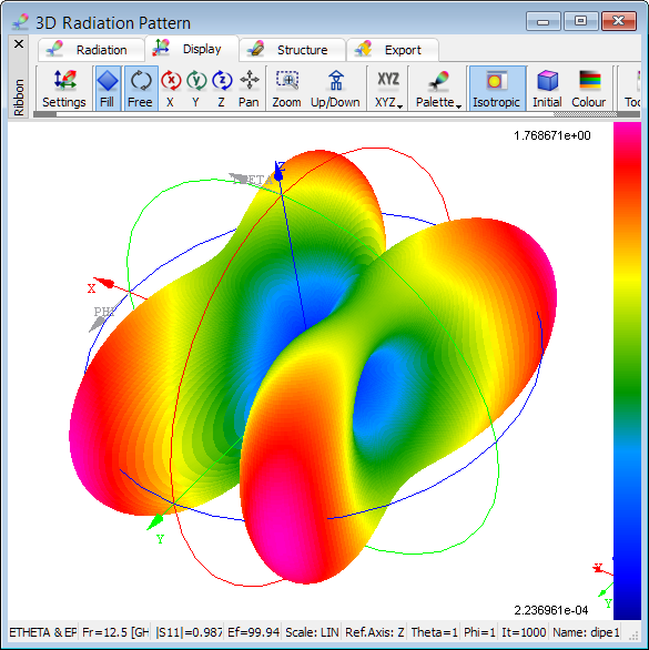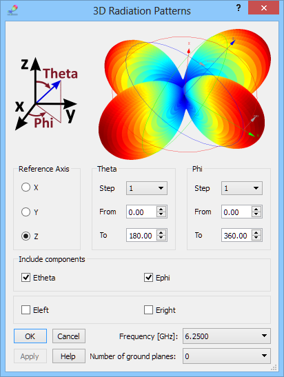 3D radiation pattern, with both Phi and Theta varying in steps, can be calculated in the 3D Radiation Pattern window. The 3D Radiation Patterns dialogue allows setting the reference axis and steps for angles Phi and Theta, defined with respect to that axis in the same way as for the 2D radiation pattern case. A single calculation frequency is also selected.