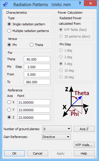 We wish to calculate the 2D radiation patterns versus angle Phi varying between 0 and 360 degrees with a step of 2 degrees. They will be calculated with a constant Theta angle equal to 90 degrees. The definition of the angles is explained in the lower right part of the 2D Radiation Patterns configuration dialogue. Note that this definition depends on the choice of the reference axis. The angle Theta is always counted from the reference axis (Z in the considered example). The angle Phi is always counted around it.