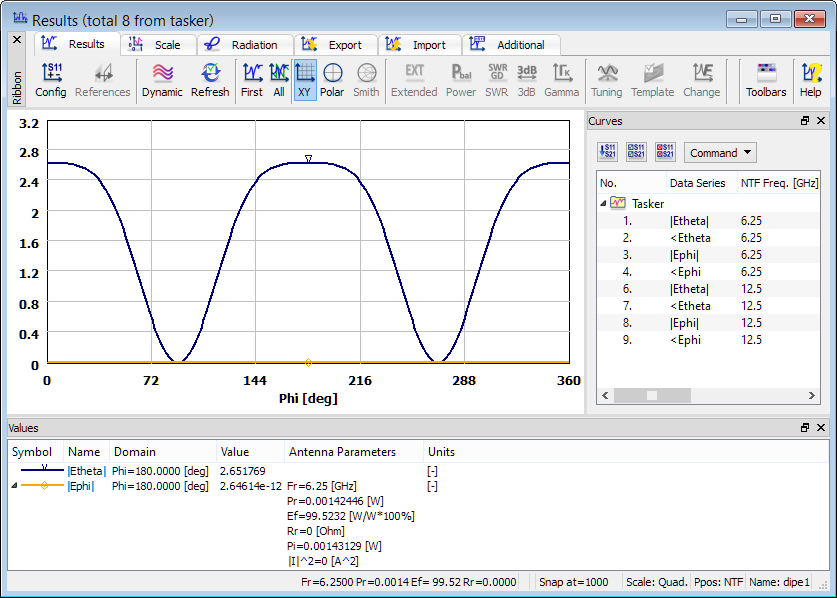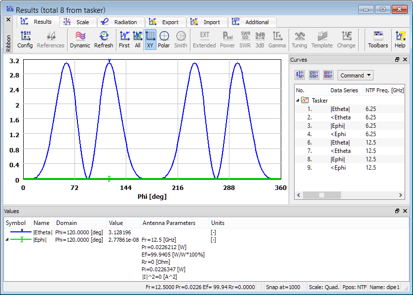 The radiation pattern calculations are set at 6.25 GHz and 12.5 GHz.