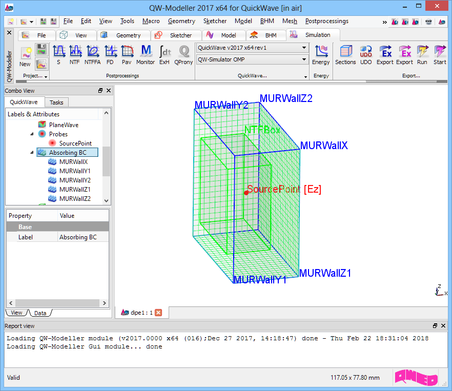 The exterior boundaries of the considered volume are absorbing except for the one where the symmetry plane is placed. The absorbing boundary conditions model the free space surrounding. In this case we use MUR absorbing boundary conditions in a form of MUR Box (blue box).