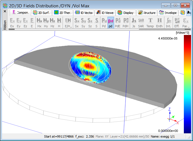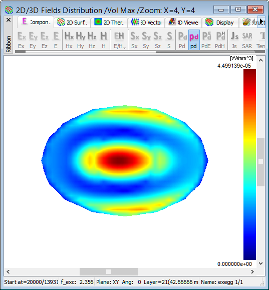 Distribution of time-maximum envelope of dissipated power density inside the egg at 2.356 GHz.