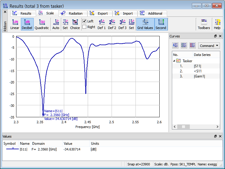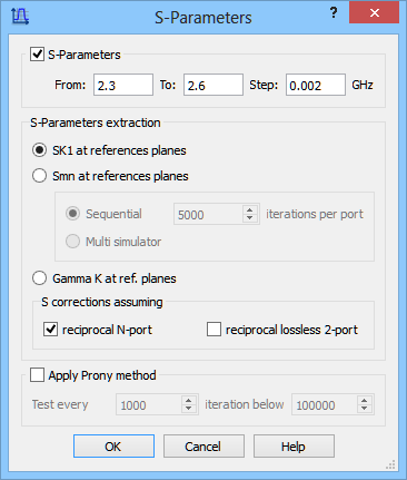 For the purpose of calculating microwave oven resonances the S-Parameters postprocessing is activated. The S-Parameters postprocessing is set from 2.3 GHz to 2.6 GHz with a frequency step of 0.002 GHz.