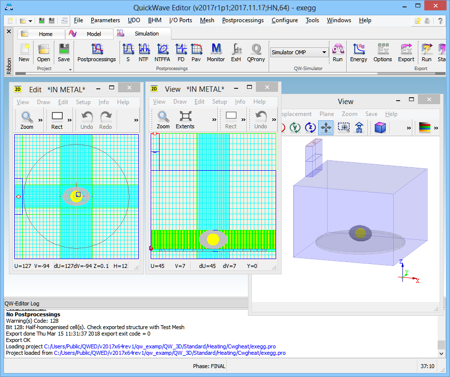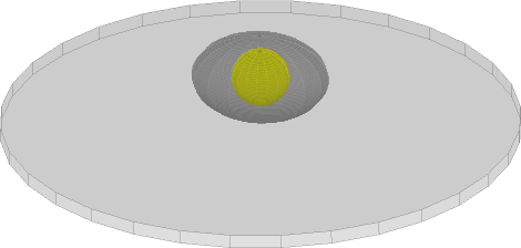 The minimum reflection in the microwave oven is recognised at 2.356 GHz. In the second step of the analysis, the model is excited with a sinusoidal at the resonant frequency to investigate the power dissipation in the egg. It can be clearly seen that the dissipated power concentrates in the centre of the egg. In the physical experiment, evaporation of water overheated in that area would cause the explosion of the egg - an experience quite memorable to many who tried it.