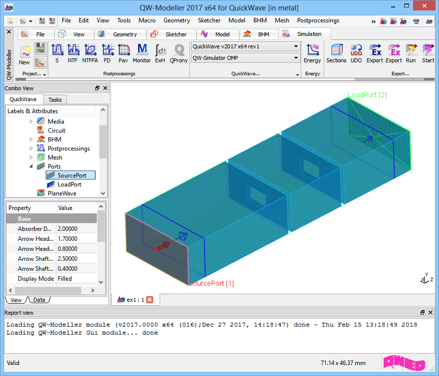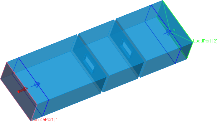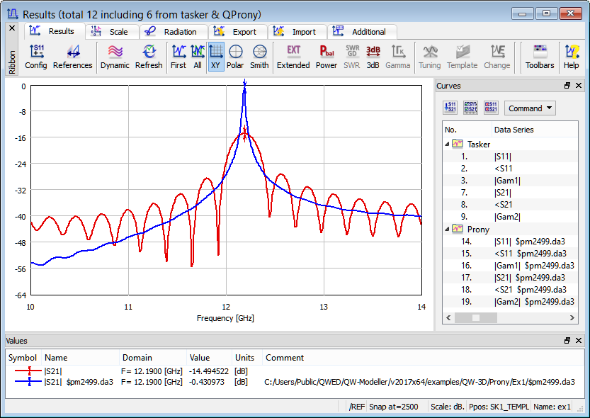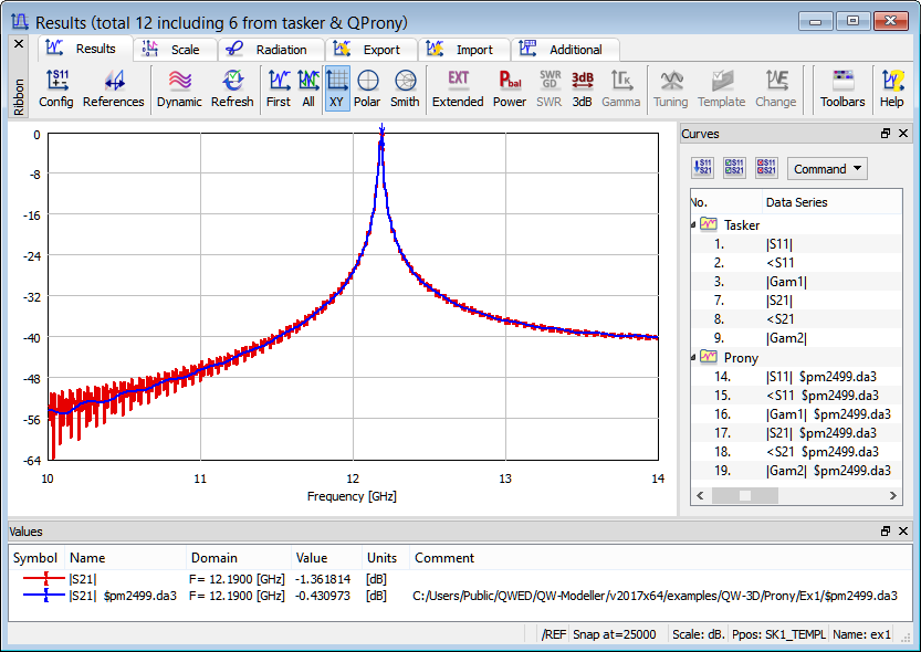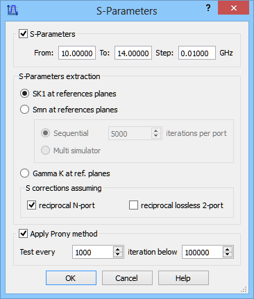 This is an example of a very simple resonant structure, which shows the weakness of traditional Fourier transform processing of circuits with long impulse response. For those kind of problem QProny module is recommended. For the purpose of calculating reflection and transmission characteristics of the structure the S-Parameters postprocessing and QProny module are activated. The S-Parameters postprocessing is set from 10 GHz to 14 GHz with a frequency step of 0.01 GHz.