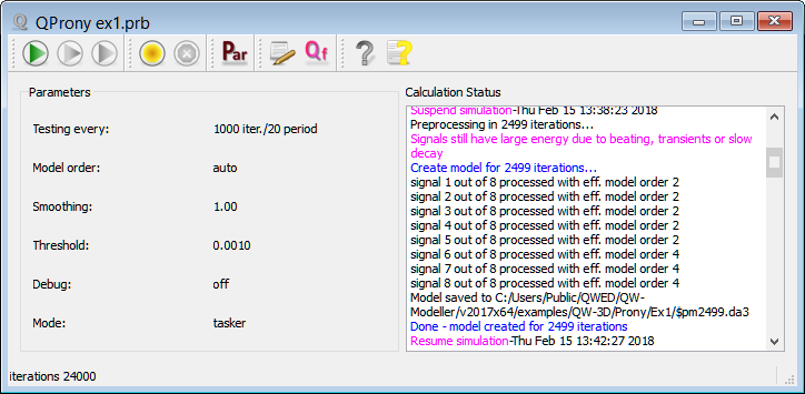 QProny module control window with Calculation Status information (information about the model created after 2499 iterations).