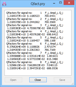 For the purpose of getting the loaded Q-factor we press the Qf button. We have one resonant frequency in the considered band. This has been signalled during the building of the QProny model by the fact that the model was of order 2 (or in other words having one double complex pole). Thus only one frequency appears. The resonant frequency is being detected in each of the signals used by the differential method of S-parameter extraction. Since we consider 4 signals at each of the transmission line ports we have a total of 8 signals. The calculated values of the loaded Q-factor extracted from each of the signals may be slightly different due to errors of the extraction method used with limited number of samples. With increasing number of samples the values calculated from different signals should merge to the correct value of the Q-factor