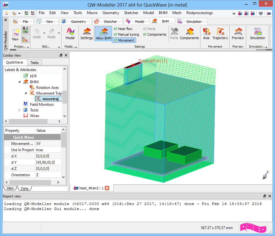 Microwave domestic oven with heating processing and two separate loads movement in QW-Modeller.