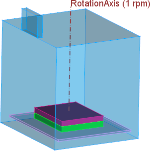 Microwave domestic oven with vertical feed, rectangular shelf, and rectangular food presenting the BHM regime with two loads rotation. The oven’s inside dimensions are 205 mm, 238 mm, and 228 mm in X, Y, Z directions respectively. Its vertical feeding waveguide dimensions are 12 mm, 70 mm, and 48 mm in X, Y, Z directions respectively. The rectangular shelf dimensions are 178 mm, 214 mm, and 4 mm in X, Y, Z directions respectively. Both foods dimensions are 50 mm, 60 mm, and 12 mm in X, Y, Z directions respectively and one lays on another. The rotation axis is located at X=-101.5mm and Y=-2mm coordinates.