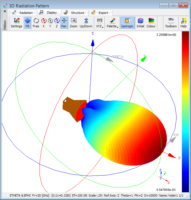 3D radiation pattern, with both Phi and Theta varying in steps can be calculated in the 3D Radiation Pattern window. The 3D Radiation Patterns dialogue allows setting the reference axis and steps for angles Phi and Theta, defined with respect to that axis in the same way as for the 2D radiation pattern case. A single frequency is also selected.