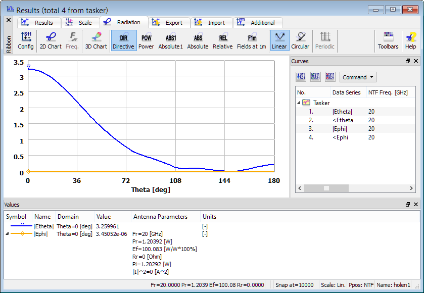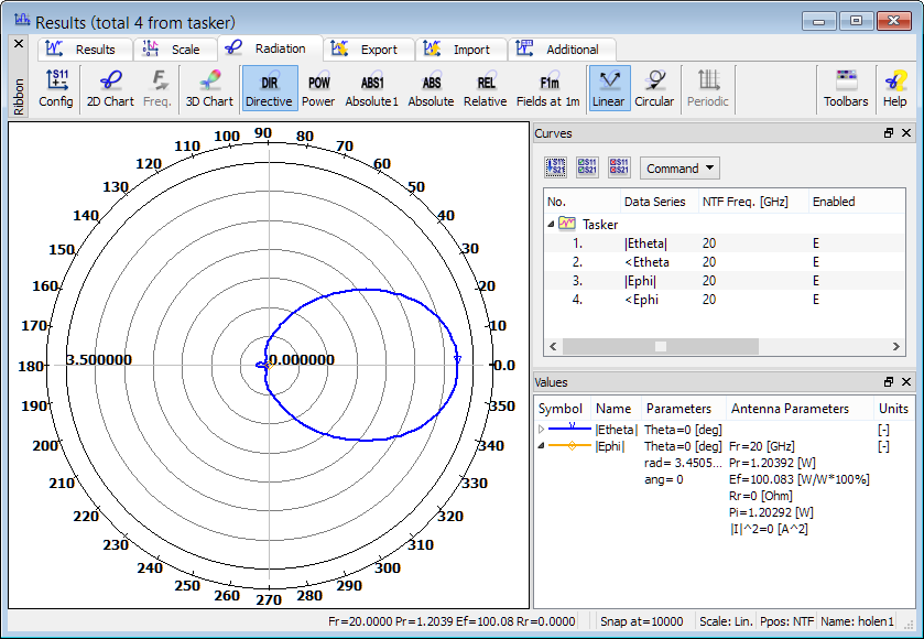2D radiation patterns in polar coordinates calculated at 20 GHz.