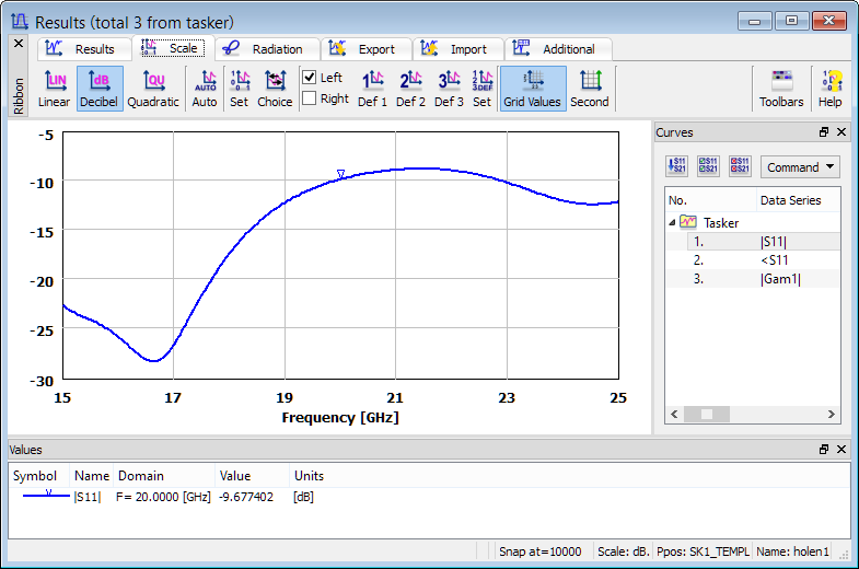 The S-Parameters postprocessing is set from 15 GHz to 25 GHz with the frequency step of 0.05 GHz.