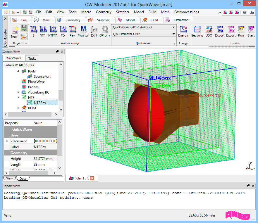 For the purpose of calculating radiation patterns, the project contains NTF Box (green box), which is a virtual box determining the boundaries at which the near-to-far field transformation will be executed.