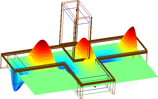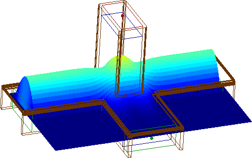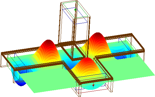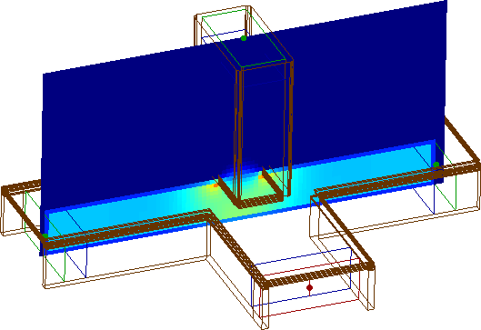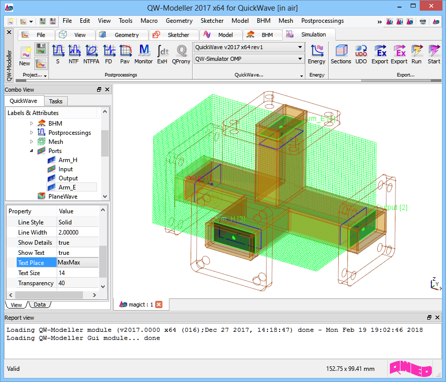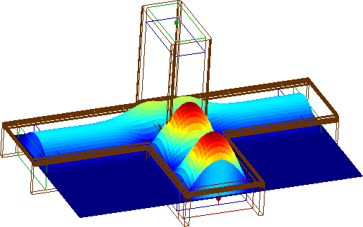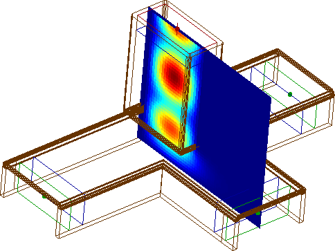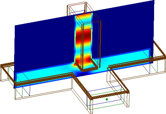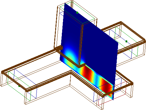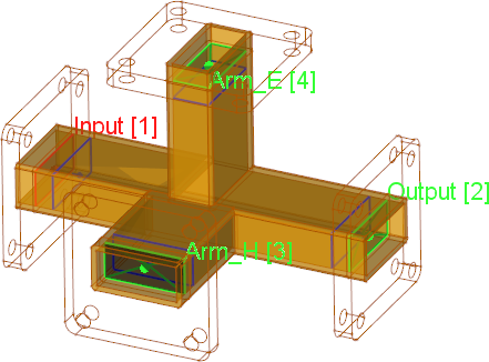 The structure is a model of X-band magic T (or magic tee or hybrid tee) waveguide coupler without matching elements (empty inside). The magic T consists of four rectangular waveguides (WR90 22.86 x 10.16 mm) meeting in a single junction. The ports are located inside the arms, behind the flanges. The FDTD mesh is limited to active areas only (flanges are not included) to make scenario as compact as possible.