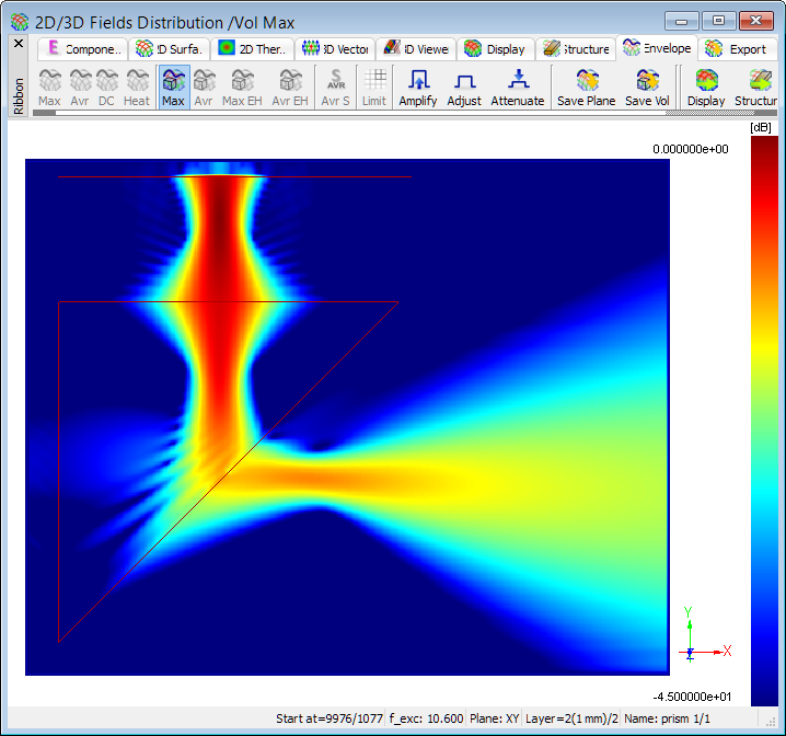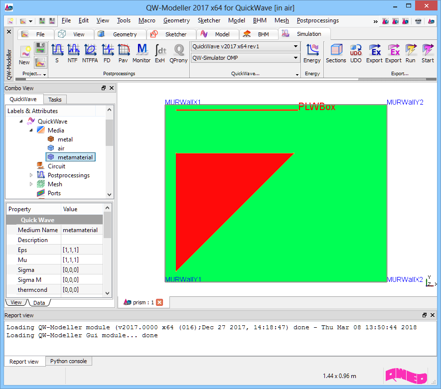 The triangular prism is located in the open-air region. The prism width and height are 530 mm and it is made of metamaterial with Drude dispersive model applied for both, electric and magnetic material properties.