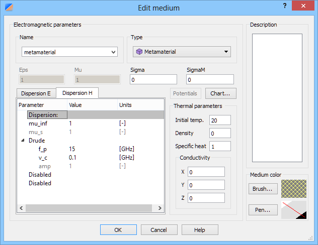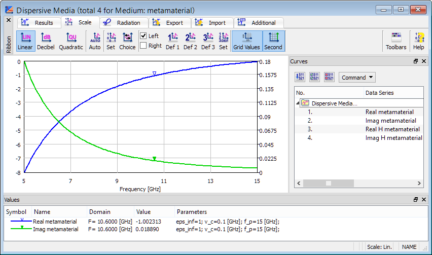 The dispersive model of the prism material was adjusted to obtain the real part of the relative permittivity (permeability) close to εr' = -1 (µr' = -1) at the excitation frequency f=10.6 GHz.