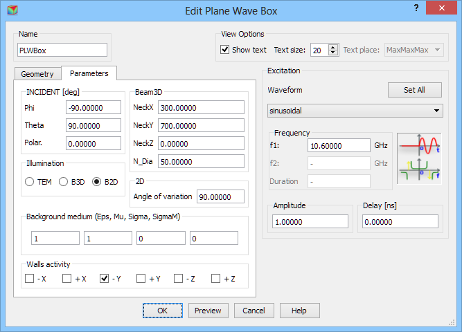 For the purpose of exciting free space incident wave we introduce an auxiliary surface called PLW Box (Plane Wave Box). A single PLW Box wall has been placed above the prism to illuminate it with the 2D Gaussian beam with the following parameters: