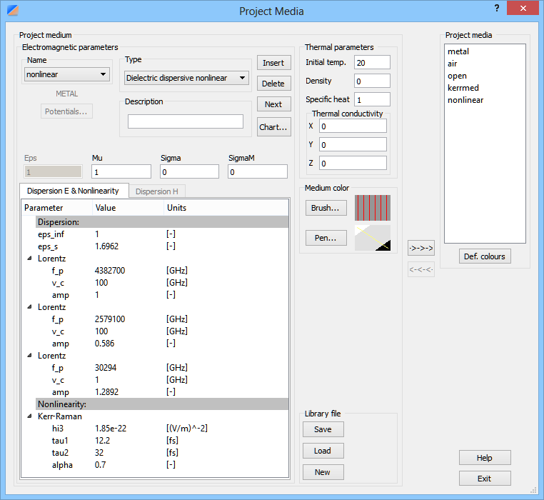 Parameters od the dispersive material given by Lorentz model supplemented with Kerr and Raman nonlinearities.