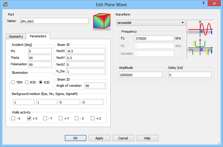 The two-dimensional line is excited with two free space incident waves (excitation is realised by two PLW boxes, marked red, situated at the same place and surrounded by absorbing exterior boundaries, marked as blue boxes). The 2D Gaussian beam (B2D option) is used for both excitations, however different values for X and Y neck centre are set. The excitation is towards +X direction (only +X chosen in Walls activity option).
