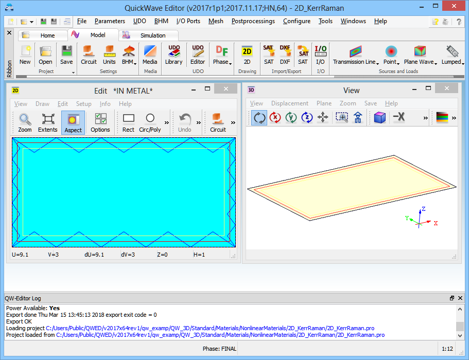 A two-dimensional line filled with a dispersive material project in QW-Editor.